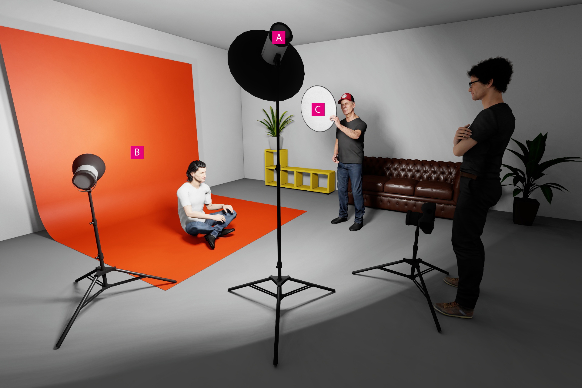 Das Modell sitzt ca. einen Meter vom farbigen Hintergrund entfernt im Schneidersitz. Das Hauptlicht [A] bildet ein Beauty-Dish mit einem Durchmesser von 56cm, der in einem Winkel von 30 Grad auf die Person gerichtet ist. Das Effektlicht [B] mit einem Normalreflektor erzeugt den Helligkeitsverlauf im Hintergrund. Mit unterschiedlichen Reflektorgrößen, können Sie den Verlauf abwechslungsreich beeinflussen. Punktuell kommt ein Aufheller [C] zum Einsatz. Für den Aufmacher wurde eine Vollformatkamera auf Augenhöhe des Modells platziert und eine Brennweite von 70mm sowie eine Blende f/8.0 eingestellt.