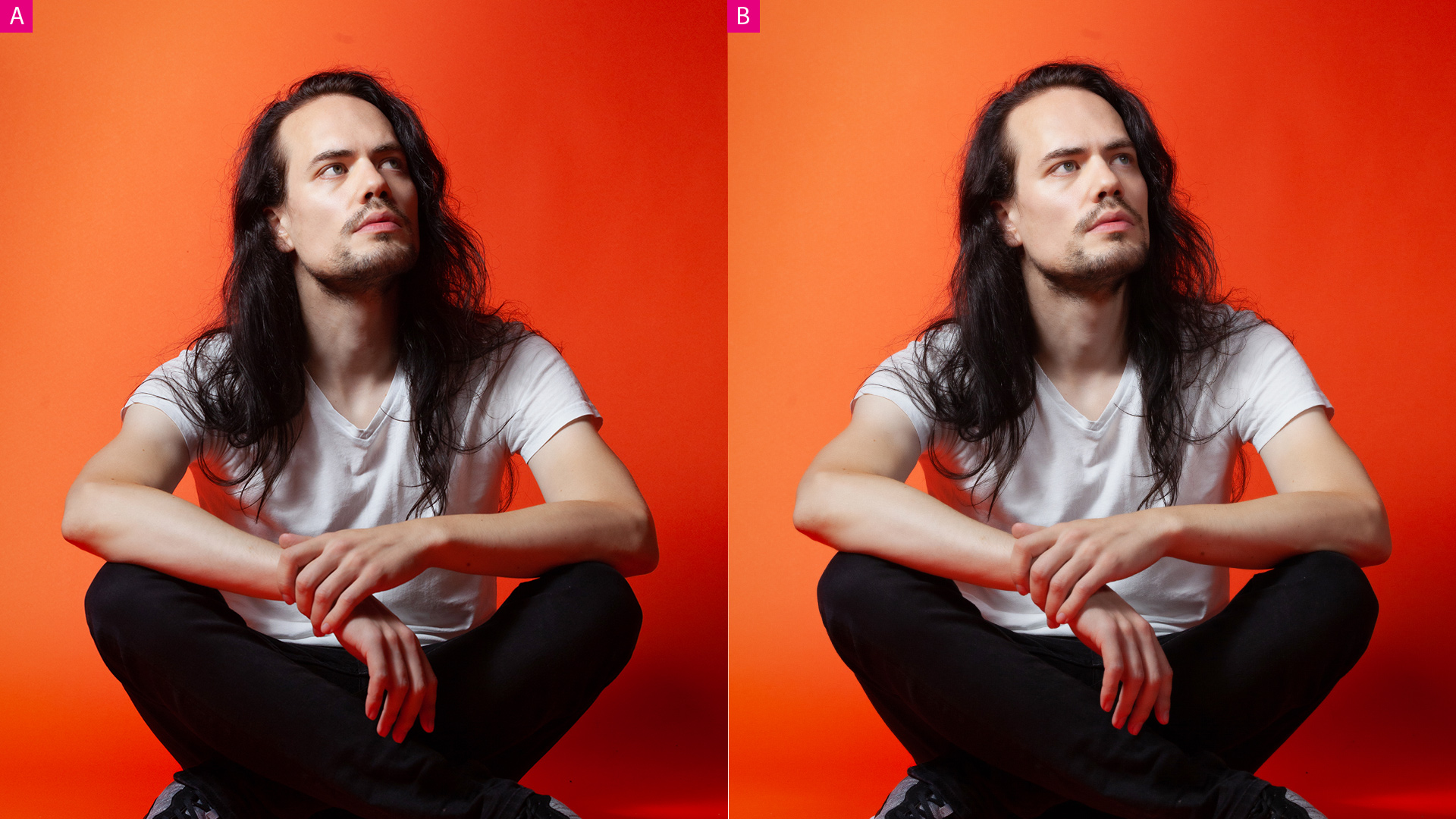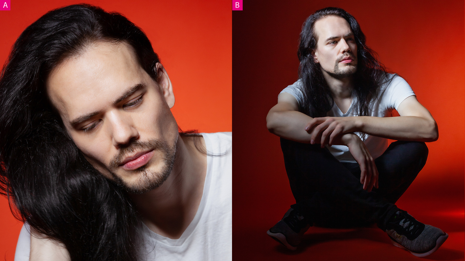 Das vorgestellte Set-up können Sie im Laufe des Shootings variabel einsetzen. Es eignet sich ebenfalls für Close-ups wie im Beispiel [A]. Achten Sie darauf, die dem Licht abgewandte Seite mit einem Reflektor aufzuhellen, um ein leichtes Streiflicht zu erhalten. In diesem Fall erzeugt der Reflektor eine leichte Lichtkante am Kiefer und grenzt dadurch die dunklere Halspartie ab. Ein völlig anderes Licht erhalten Sie, indem Sie auf das Hintergrundlicht verzichten und eine Wabe in den Beauty-Dish einsetzen. Beispiel [B] zeigt ein deutlich kontrastreicheres Motiv und stärkere Schattenverläufe im Hintergrund, die Sie durch die Position des Beauty-Dishs kontrollieren können.