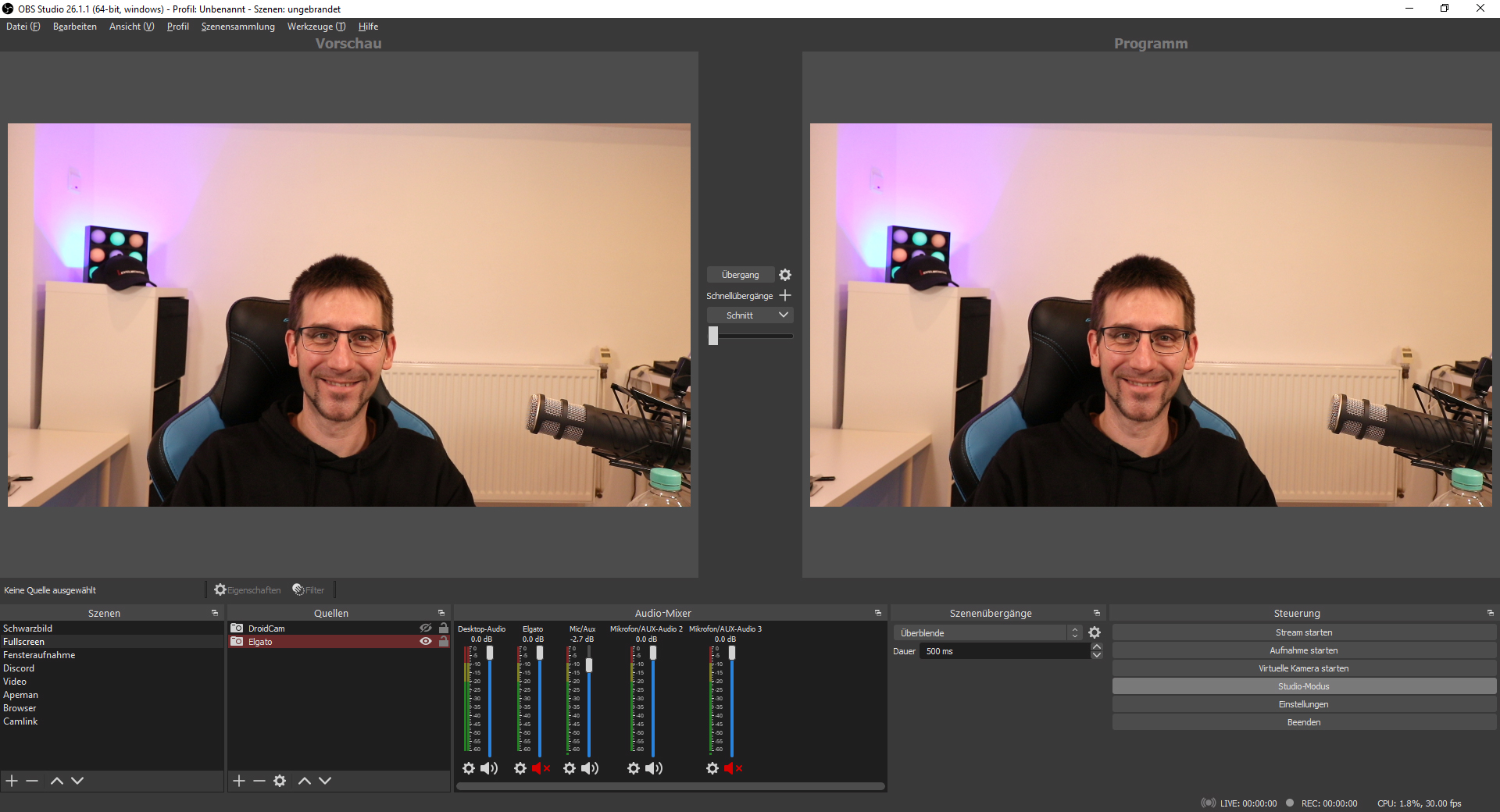 Dieser Artikel beschreibt nur eine Möglichkeit, wie Sie Ihren Arbeitsplatz gestalten können. Ich berate meine Kunden natürlich auch individuell und zeige, wie sie von Zuhause aus in Studioqualität Video- oder Streaming-Inhalte produzieren können. Sprechen Sie mich gerne an, wenn Sie tiefer in die Materie einsteigen wollen. Ich freue mich auf Ihre Kontaktaufnahme.