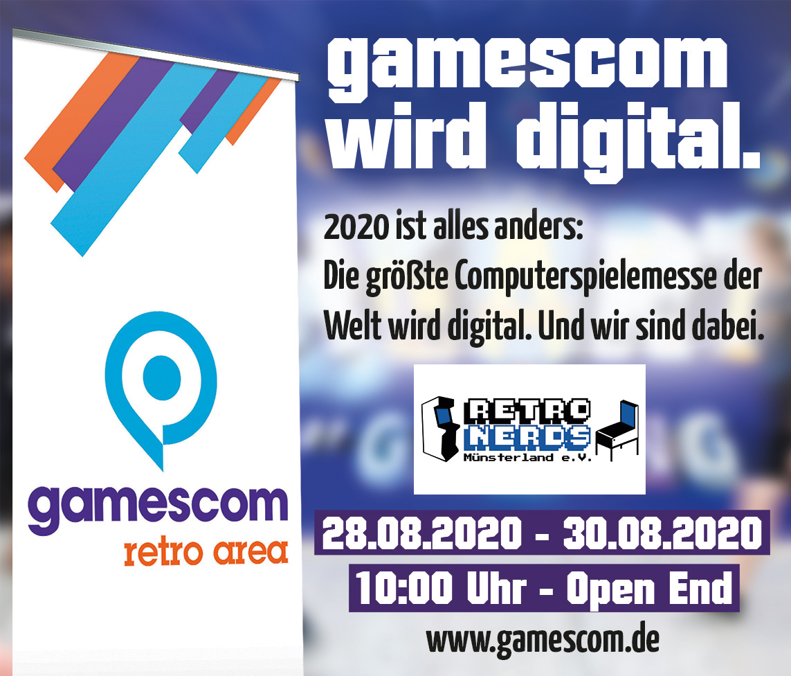 Die gamescom 2020 findet komplett digital statt – inklusive Retro Area. Mit dabei: der Retro Nerds Münsterland e.V., der drei Tage lang ein einstündiges Live-Programm rund um Arcade, Flipper und Heimcomputer auf gamescom now präsentiert.